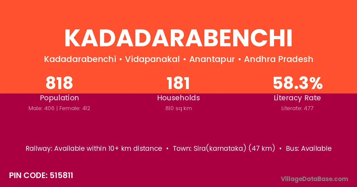 Sira(karnataka) (47 km) is the nearest town to Kadadarabenchi village for major economic activities and is located approximately 47 km away.
