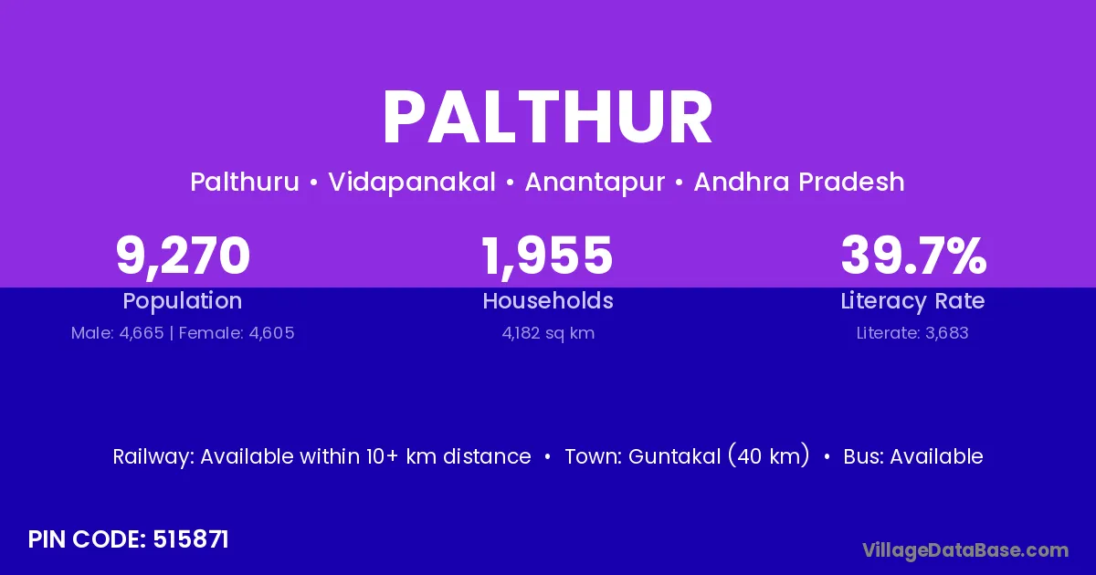 Guntakal (40 km) is the nearest town to Palthur village for major economic activities and is located approximately 40 km away.