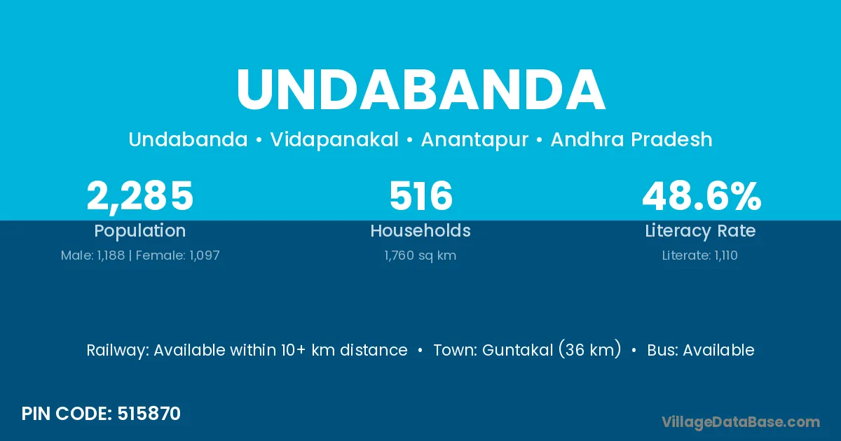 Guntakal (36 km) is the nearest town to Undabanda village for major economic activities and is located approximately 36 km away.