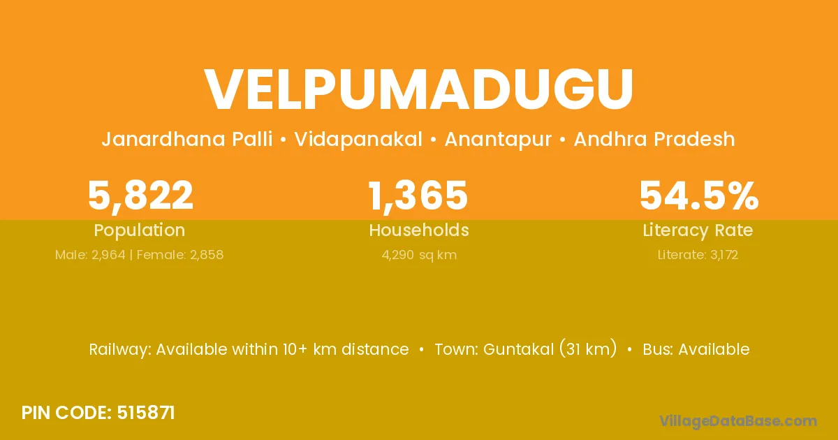 Guntakal (31 km) is the nearest town to Velpumadugu village for major economic activities and is located approximately 31 km away.