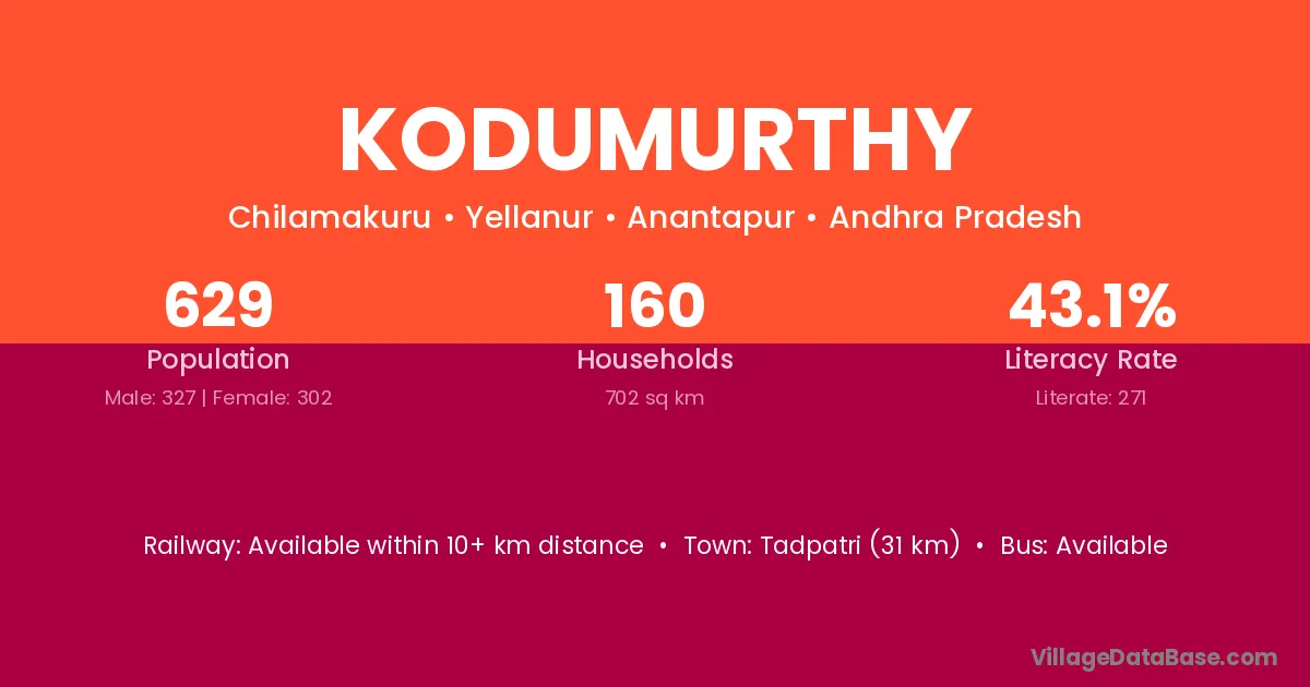 Tadpatri (31 km) is the nearest town to Kodumurthy village for major economic activities and is located approximately 31 km away.