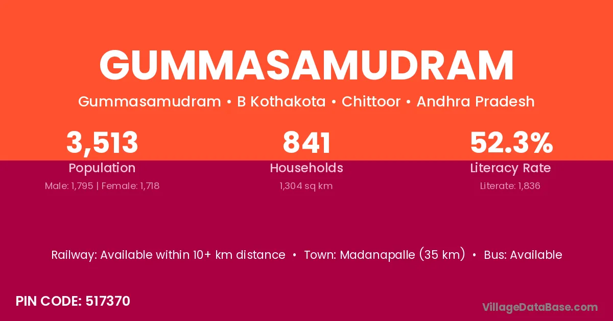 Madanapalle (35 km) is the nearest town to Gummasamudram village for major economic activities and is located approximately 35 km away.
