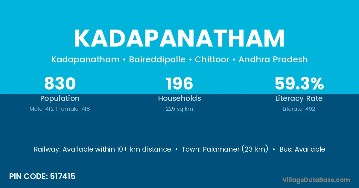 Palamaner (23 km) is the nearest town to Kadapanatham village for major economic activities and is located approximately 23 km away.
