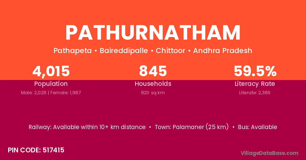 Palamaner (25 km) is the nearest town to Pathurnatham village for major economic activities and is located approximately 25 km away.