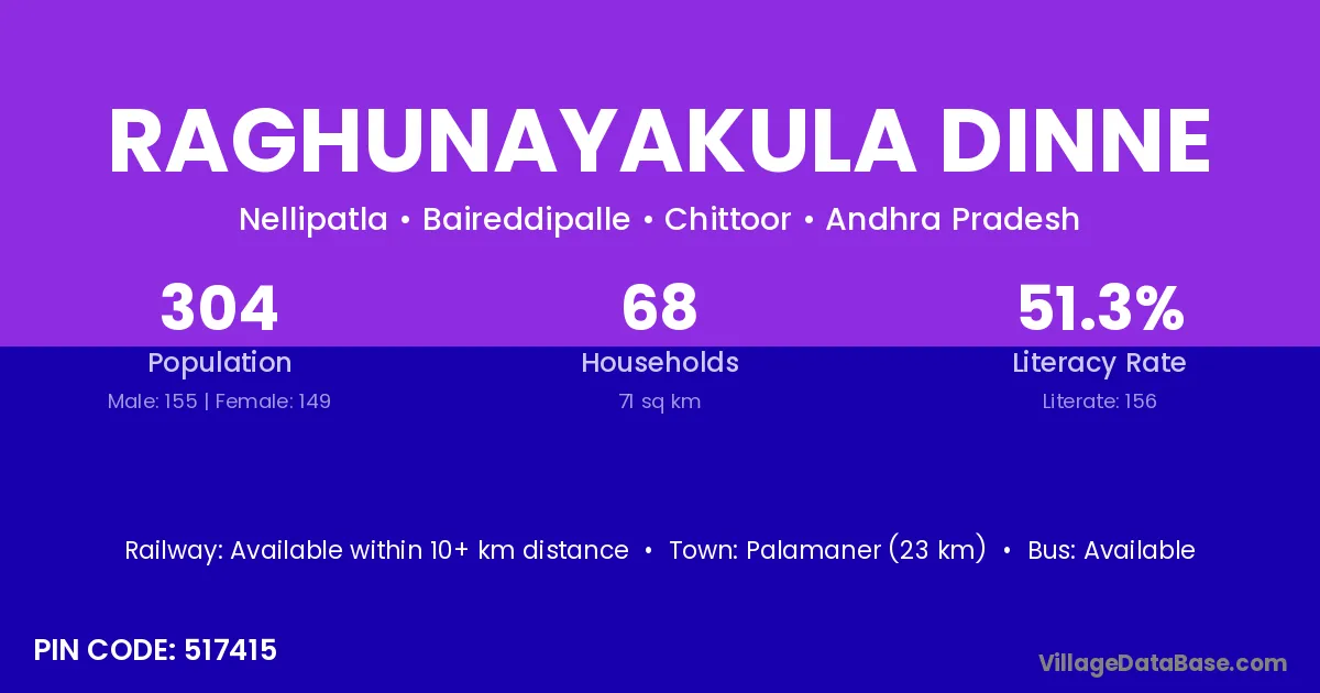 Palamaner (23 km) is the nearest town to Raghunayakula Dinne village for major economic activities and is located approximately 23 km away.
