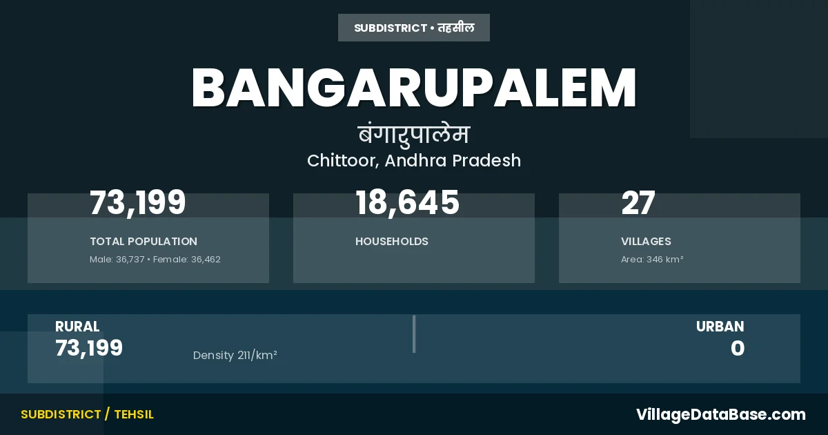 According to the 2011 census The total area of Bangarupalem Mandal is 346 km², with a population of 73199 people. The population density is 211 inhabitants per square kilometre, and there are approximately 18645 houses in the sub district.