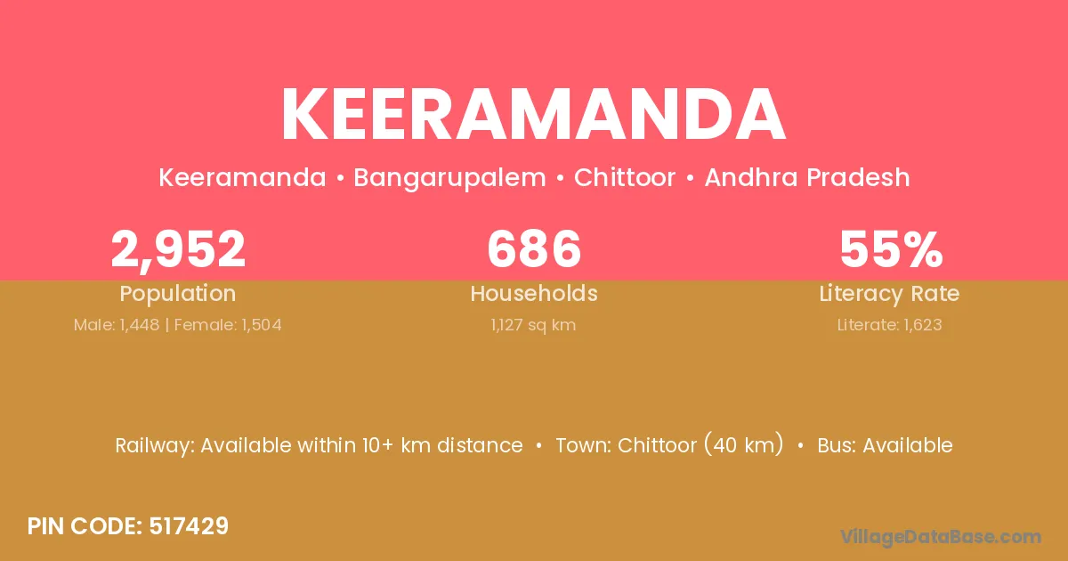 Chittoor (40 km) is the nearest town to Keeramanda village for major economic activities and is located approximately 40 km away.
