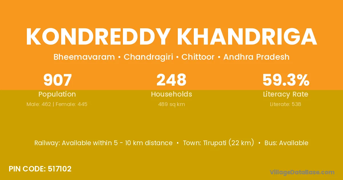 Tirupati (22 km) is the nearest town to Kondreddy Khandriga village for major economic activities and is located approximately 22 km away.