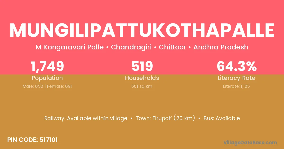 Tirupati (20 km) is the nearest town to Mungilipattukothapalle village for major economic activities and is located approximately 20 km away.