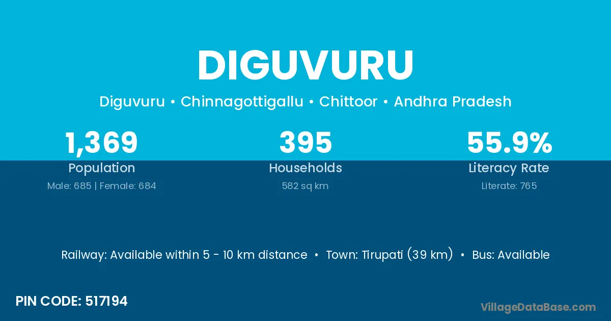 Diguvuru village has a total population of 1,369 people, of which 685 are males and 684 are females.