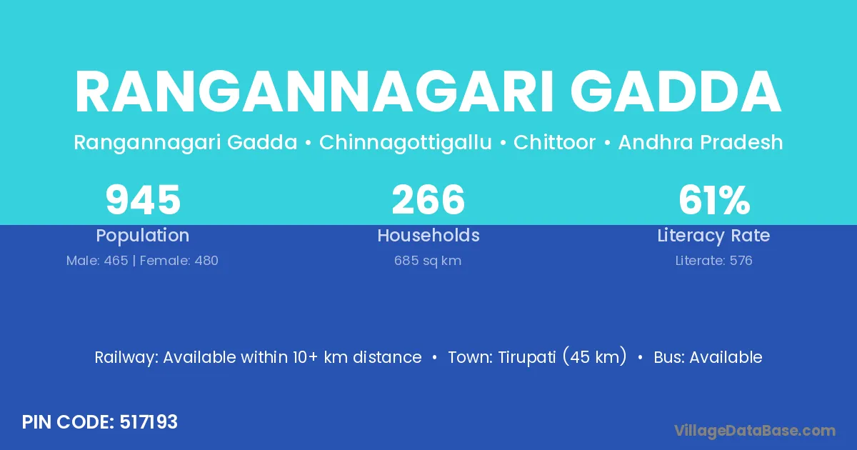 Rangannagari Gadda village has a total population of 945 people, of which 465 are males and 480 are females.