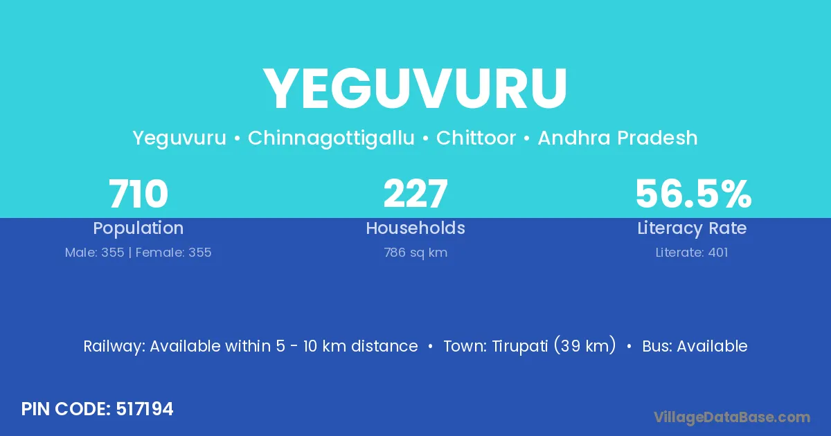 Yeguvuru village has a total population of 710 people, of which 355 are males and 355 are females.