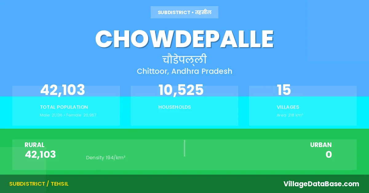 According to the 2011 census The total area of Chowdepalle Mandal is 218 km², with a population of 42103 people. The population density is 194 inhabitants per square kilometre, and there are approximately 10525 houses in the sub district.