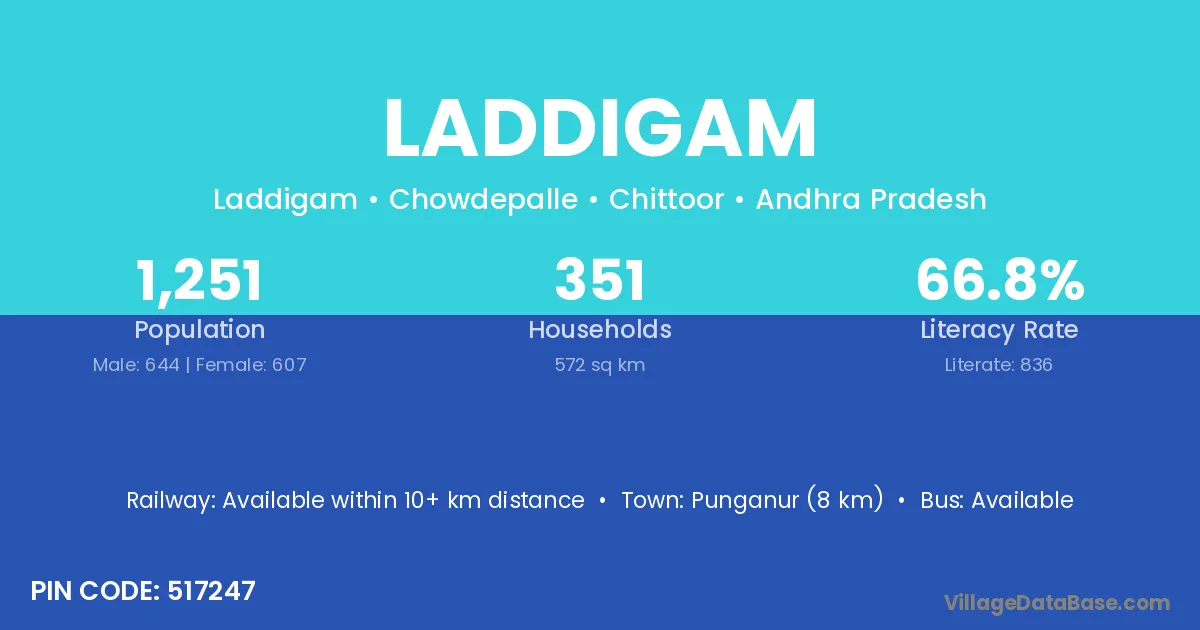Punganur (8 km) is the nearest town to Laddigam village for major economic activities and is located approximately 8 km away.