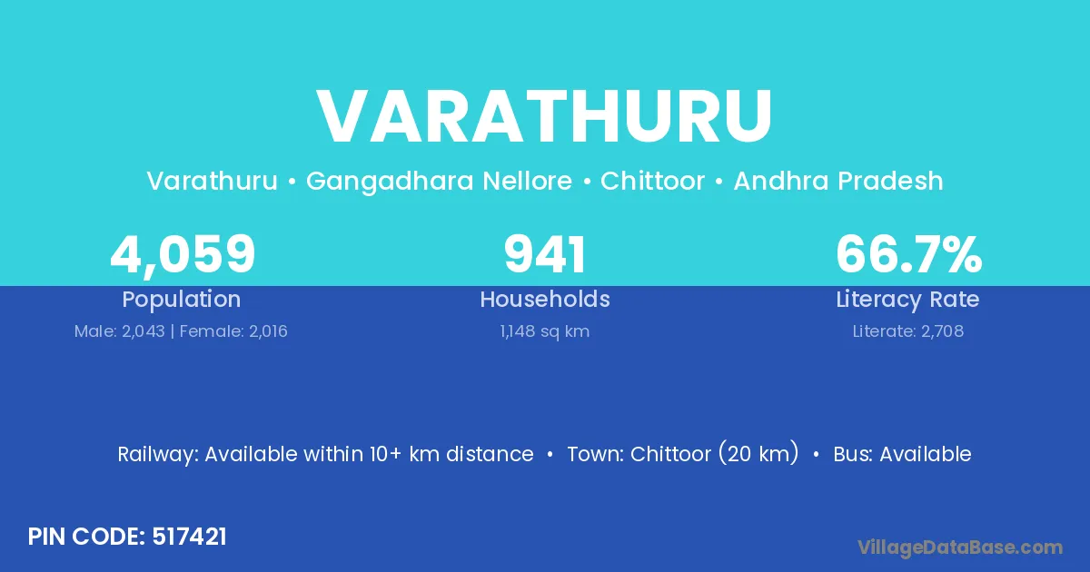 Varathuru village has a total population of 4,059 people, of which 2,043 are males and 2,016 are females.