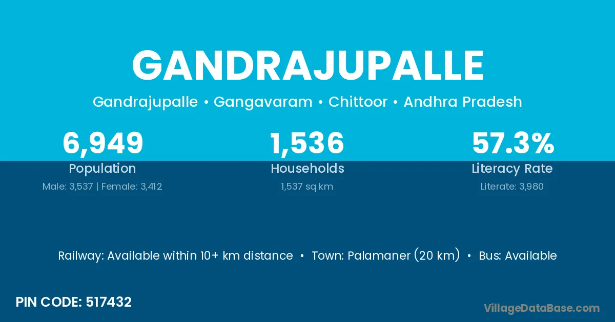 Palamaner (20 km) is the nearest town to Gandrajupalle village for major economic activities and is located approximately 20 km away.