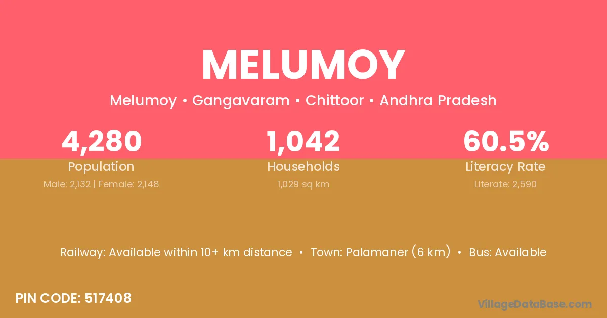 Palamaner (6 km) is the nearest town to Melumoy village for major economic activities and is located approximately 6 km away.