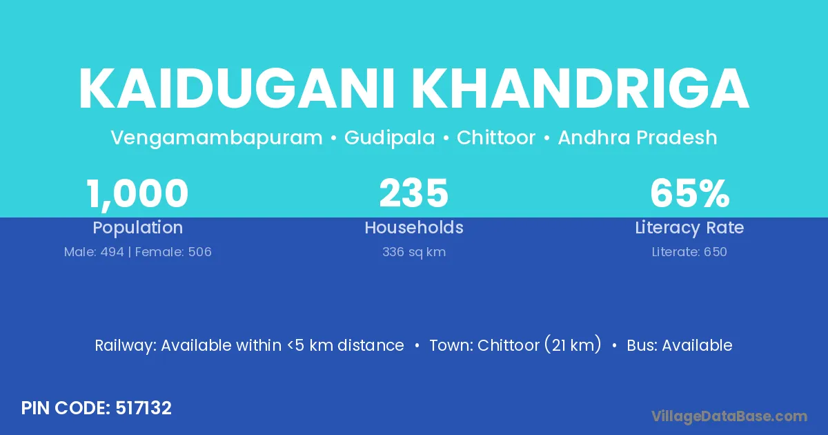Chittoor (21 km) is the nearest town to Kaidugani Khandriga village for major economic activities and is located approximately 21 km away.