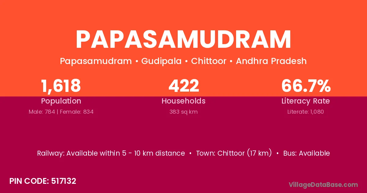 Chittoor (17 km) is the nearest town to Papasamudram village for major economic activities and is located approximately 17 km away.