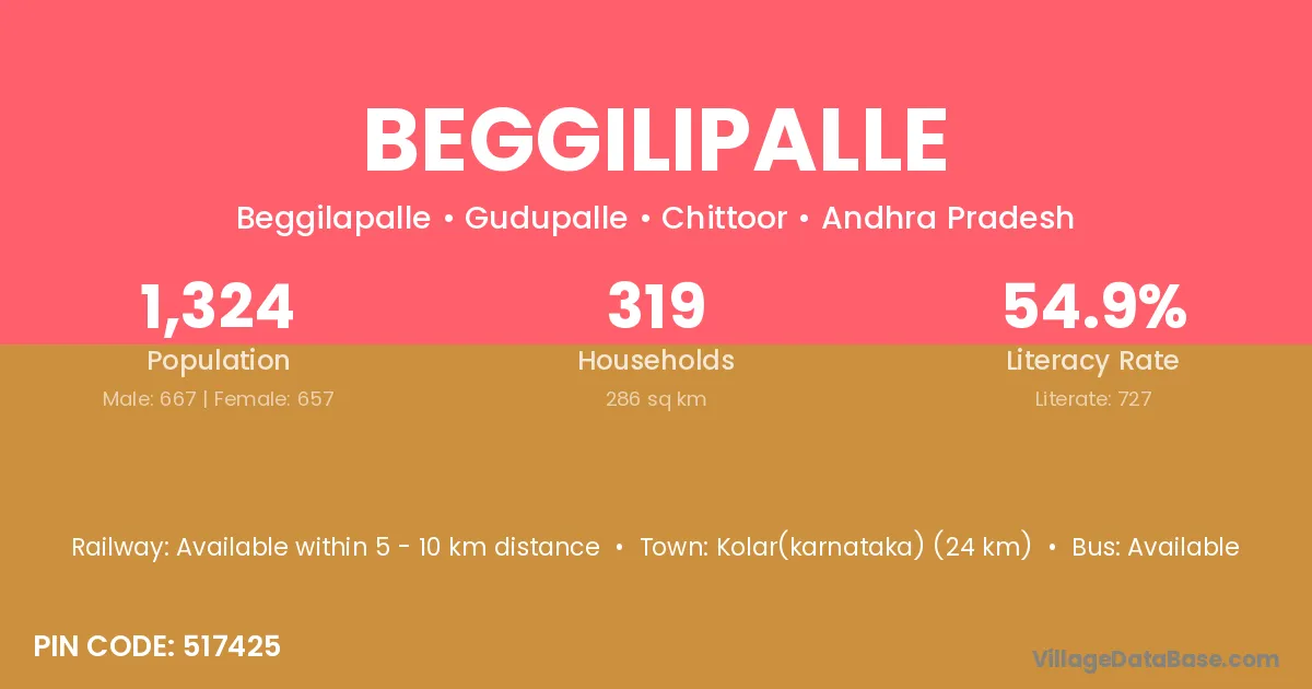 Beggilipalle village has a total population of 1,324 people, of which 667 are males and 657 are females.