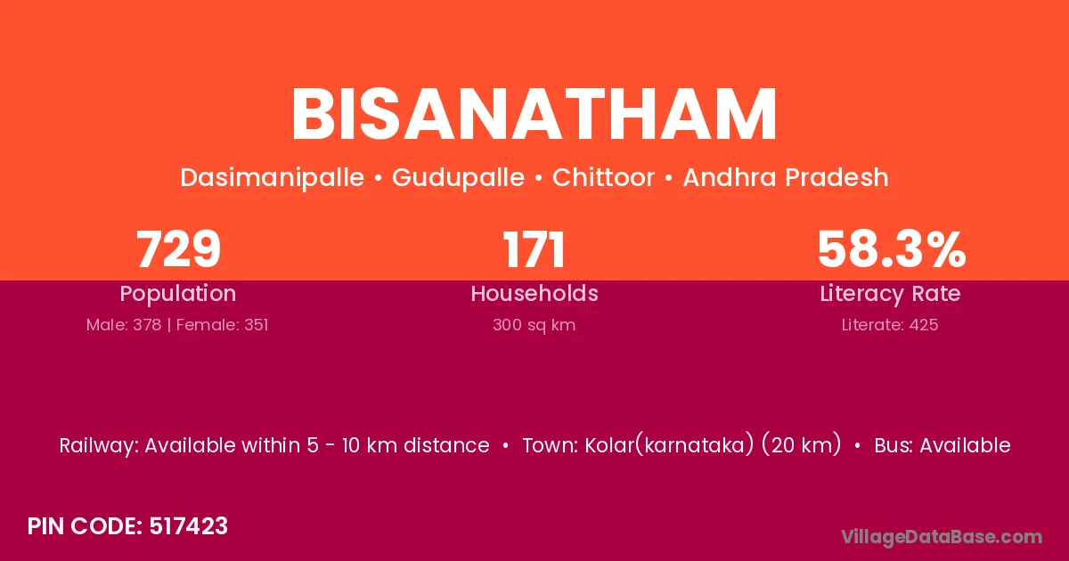 Bisanatham village has a total population of 729 people, of which 378 are males and 351 are females.