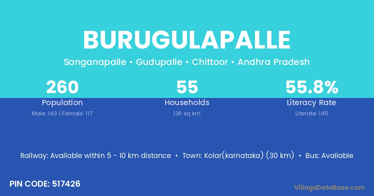 Burugulapalle village has a total population of 260 people, of which 143 are males and 117 are females.