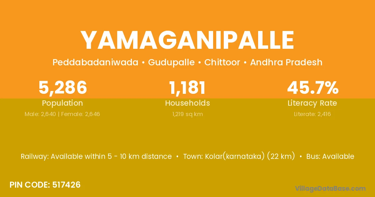 Yamaganipalle village has a total population of 5,286 people, of which 2,640 are males and 2,646 are females.