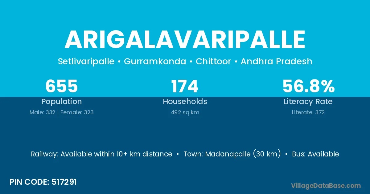 Madanapalle (30 km) is the nearest town to Arigalavaripalle village for major economic activities and is located approximately 30 km away.