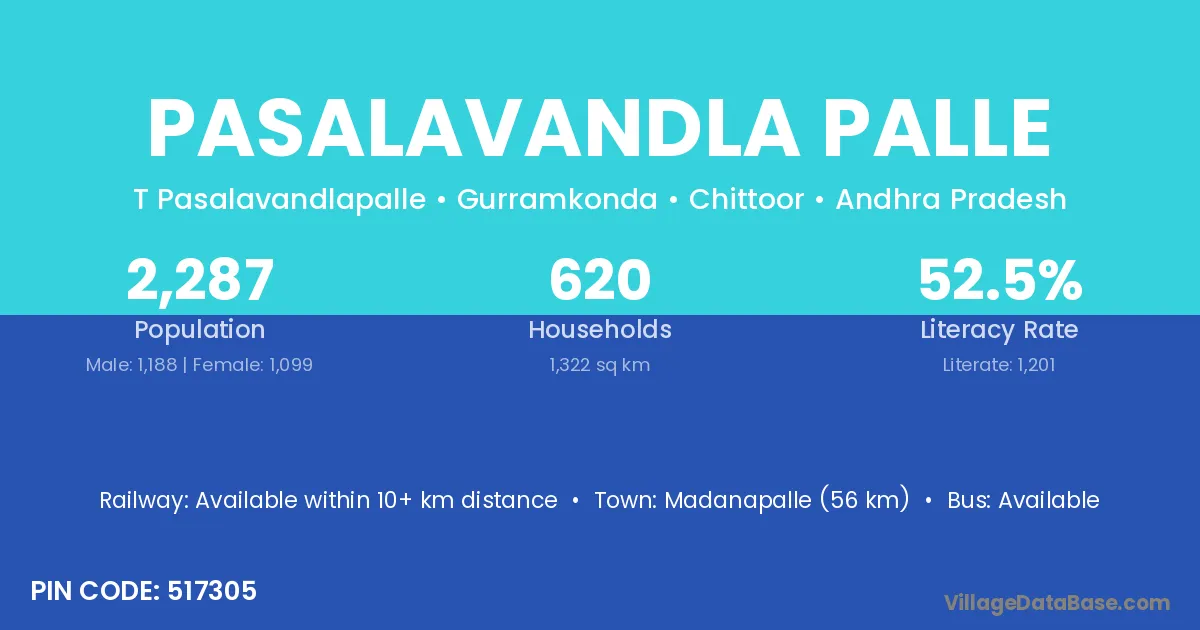 Pasalavandla Palle village has a total population of 2,287 people, of which 1,188 are males and 1,099 are females.