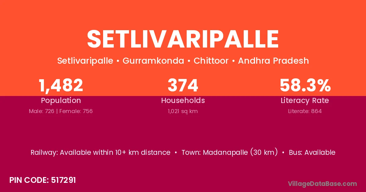 Madanapalle (30 km) is the nearest town to Setlivaripalle village for major economic activities and is located approximately 30 km away.