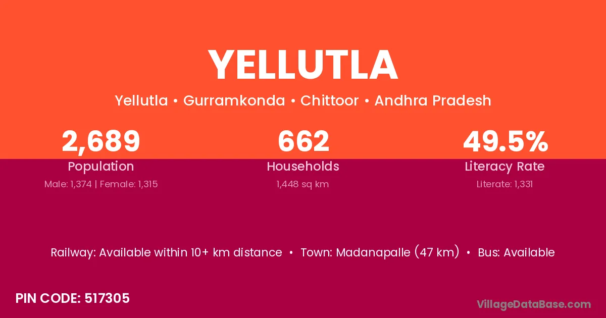 Madanapalle (47 km) is the nearest town to Yellutla village for major economic activities and is located approximately 47 km away.