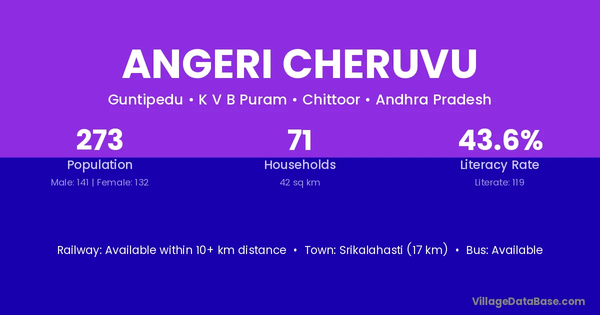 Srikalahasti (17 km) is the nearest town to Angeri Cheruvu village for major economic activities and is located approximately 17 km away.