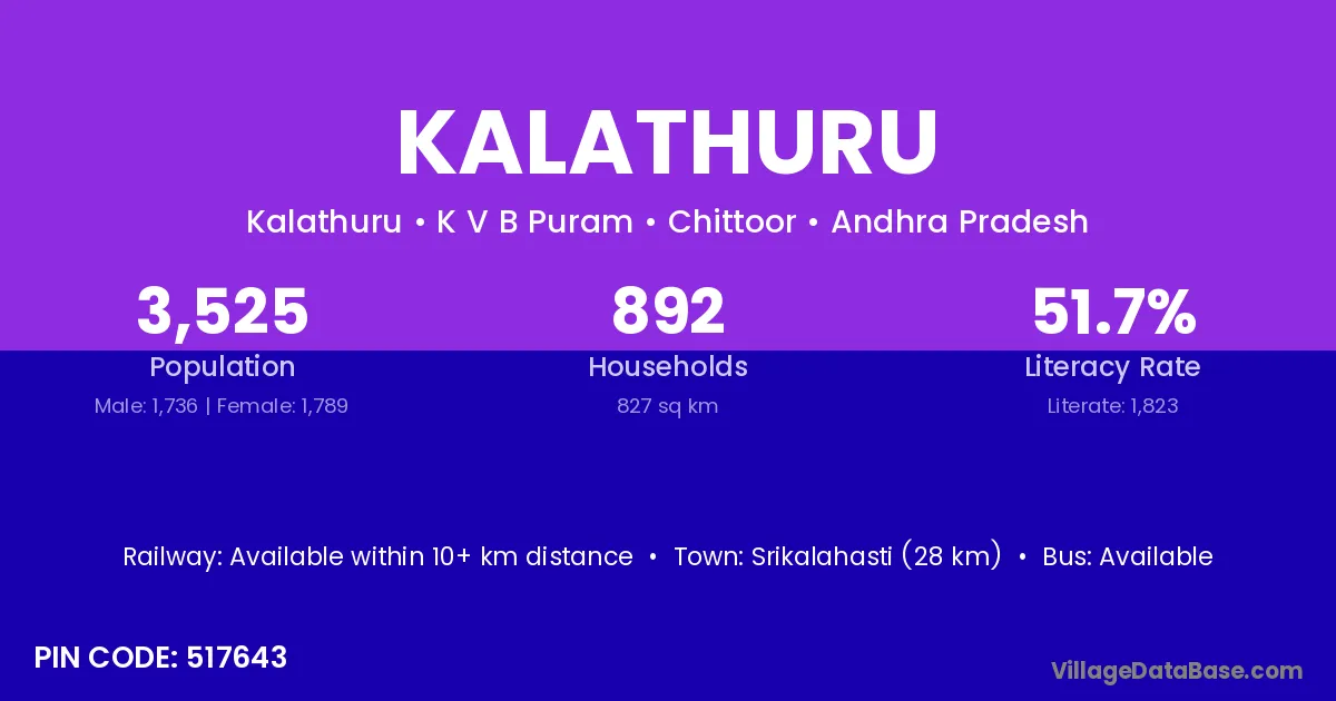 Srikalahasti (28 km) is the nearest town to Kalathuru village for major economic activities and is located approximately 28 km away.