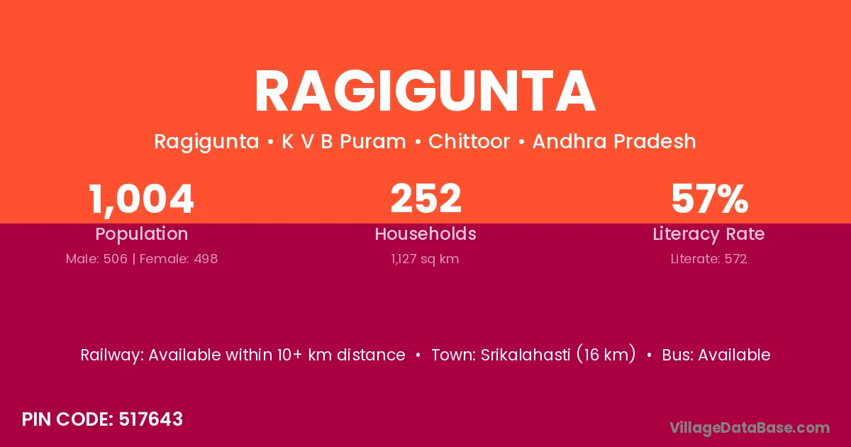 Ragigunta village has a total population of 1,004 people, of which 506 are males and 498 are females.