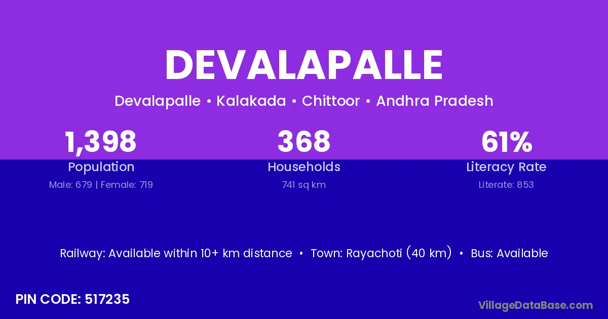 Rayachoti (40 km) is the nearest town to Devalapalle village for major economic activities and is located approximately 40 km away.