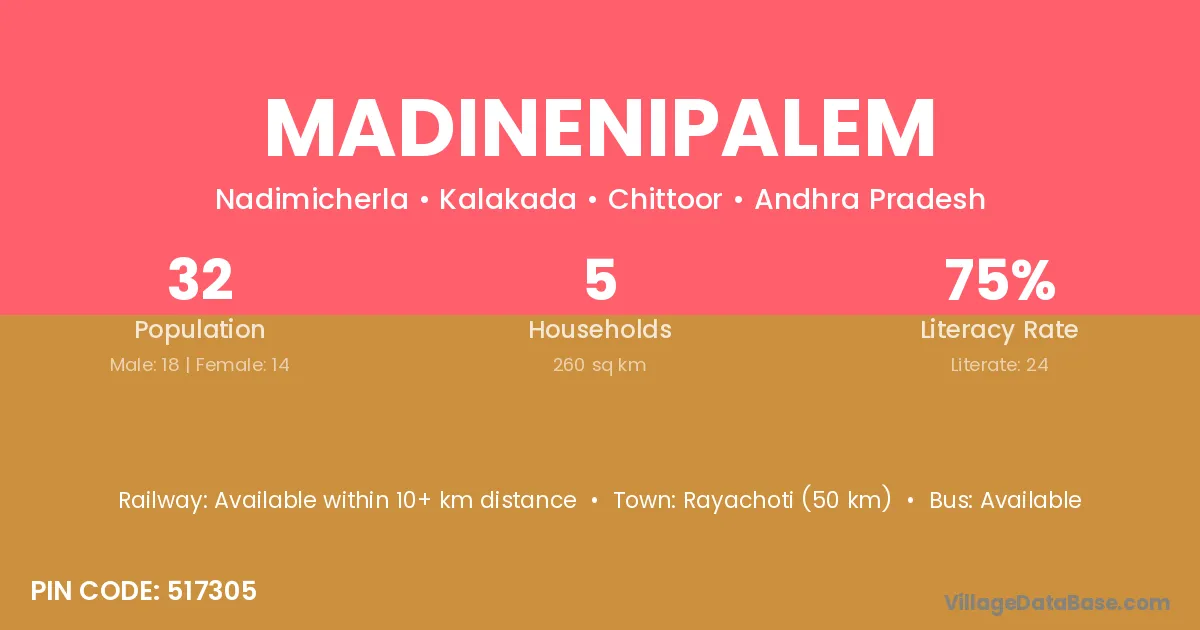 Madinenipalem village has a total population of 32 people, of which 18 are males and 14 are females.