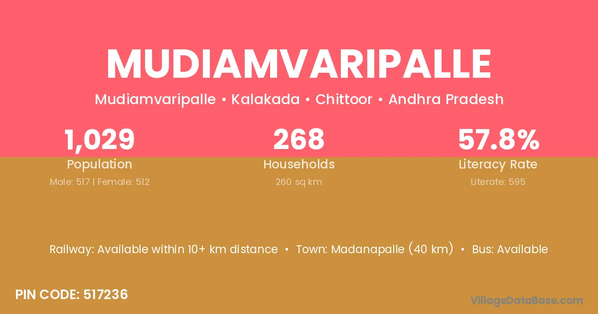 Mudiamvaripalle village has a total population of 1,029 people, of which 517 are males and 512 are females.