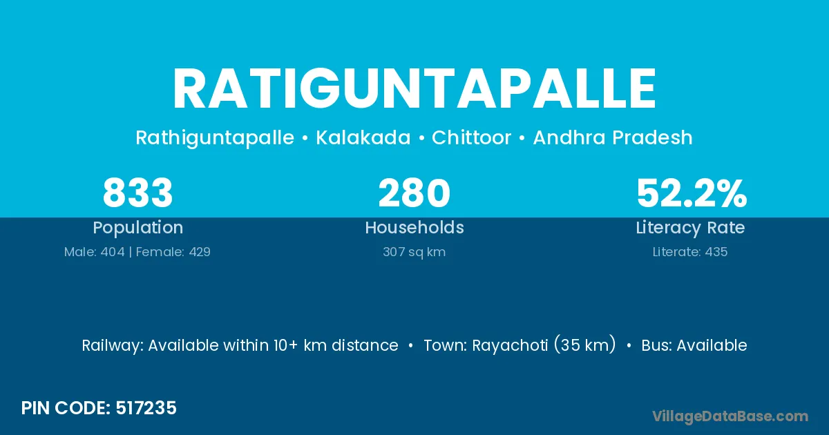 Rayachoti (35 km) is the nearest town to Ratiguntapalle village for major economic activities and is located approximately 35 km away.