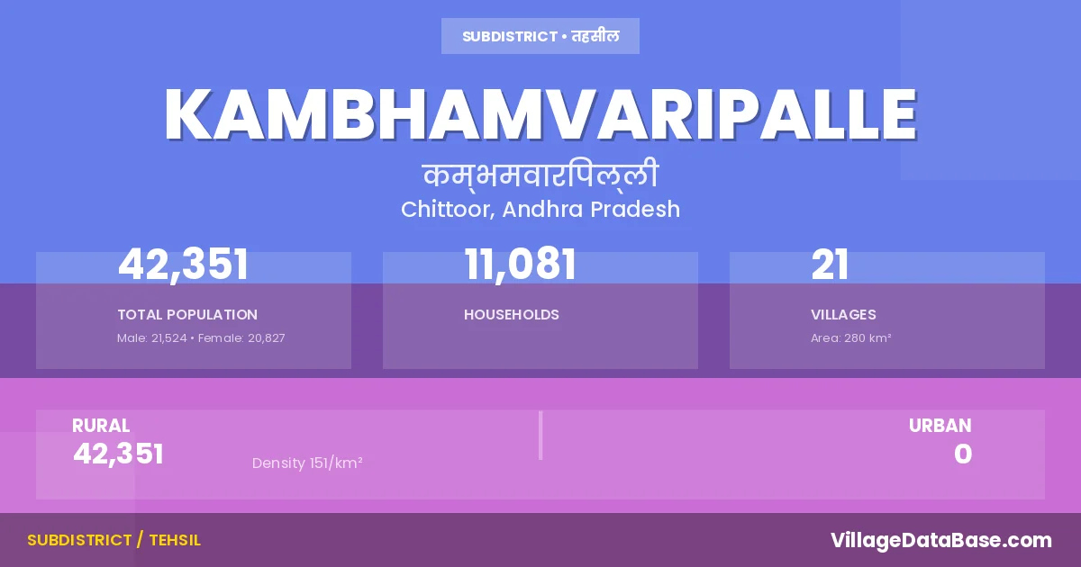 According to the 2011 census The total area of Kambhamvaripalle Mandal is 280 km², with a population of 42351 people. The population density is 151 inhabitants per square kilometre, and there are approximately 11081 houses in the sub district.