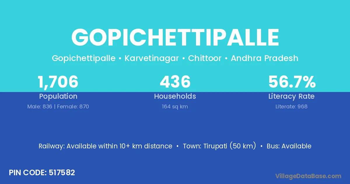 Tirupati (50 km) is the nearest town to Gopichettipalle village for major economic activities and is located approximately 50 km away.