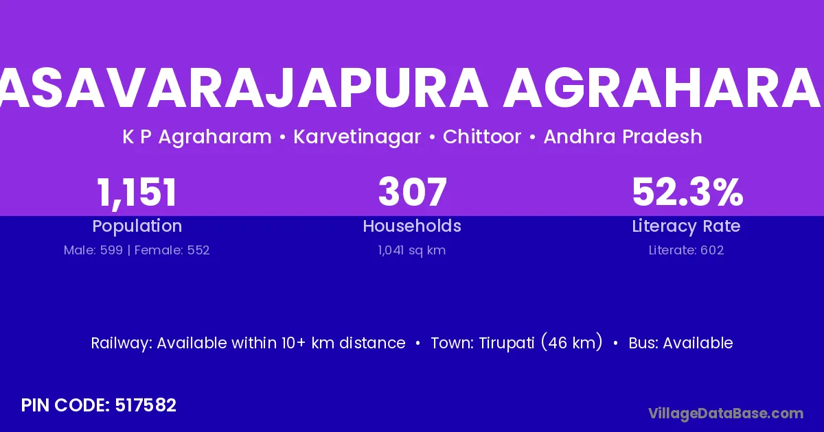 Kasavarajapura Agraharam village has a total population of 1,151 people, of which 599 are males and 552 are females.