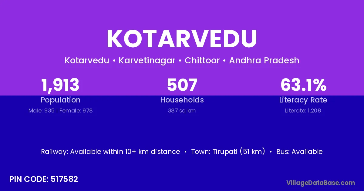 Tirupati (51 km) is the nearest town to Kotarvedu village for major economic activities and is located approximately 51 km away.