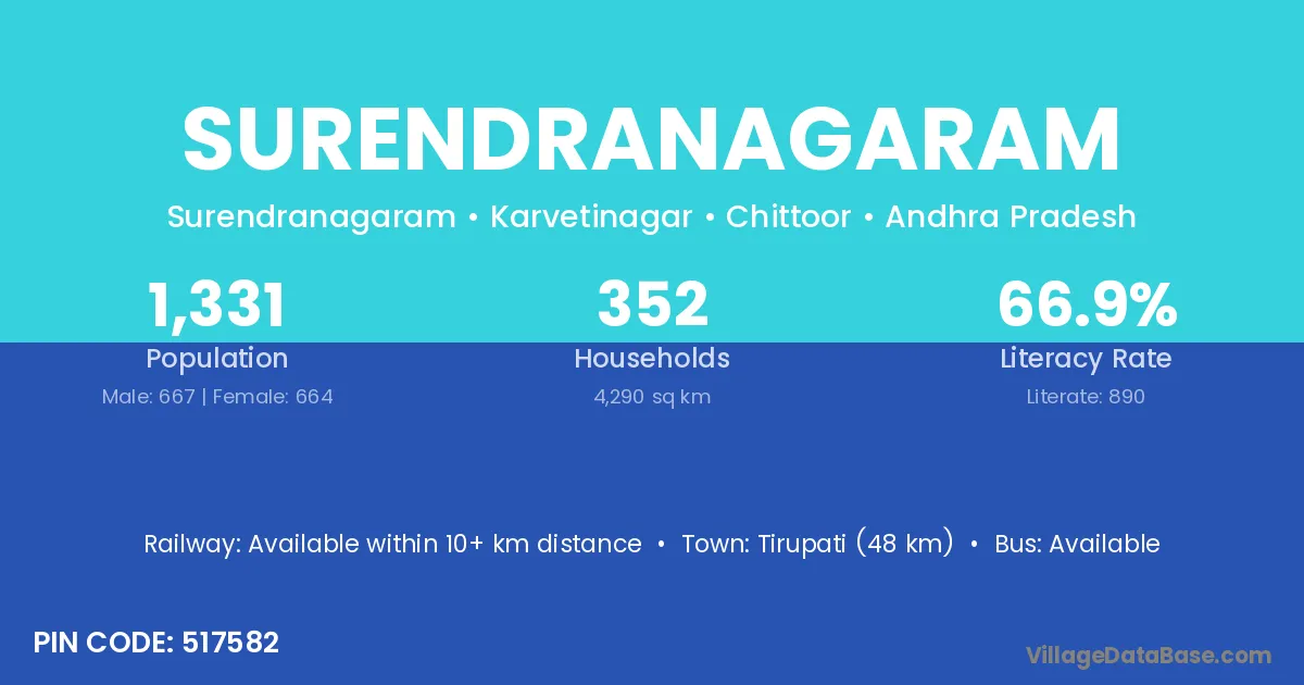 Tirupati (48 km) is the nearest town to Surendranagaram village for major economic activities and is located approximately 48 km away.