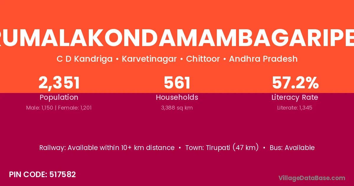Tirupati (47 km) is the nearest town to Tirumalakondamambagaripeta village for major economic activities and is located approximately 47 km away.