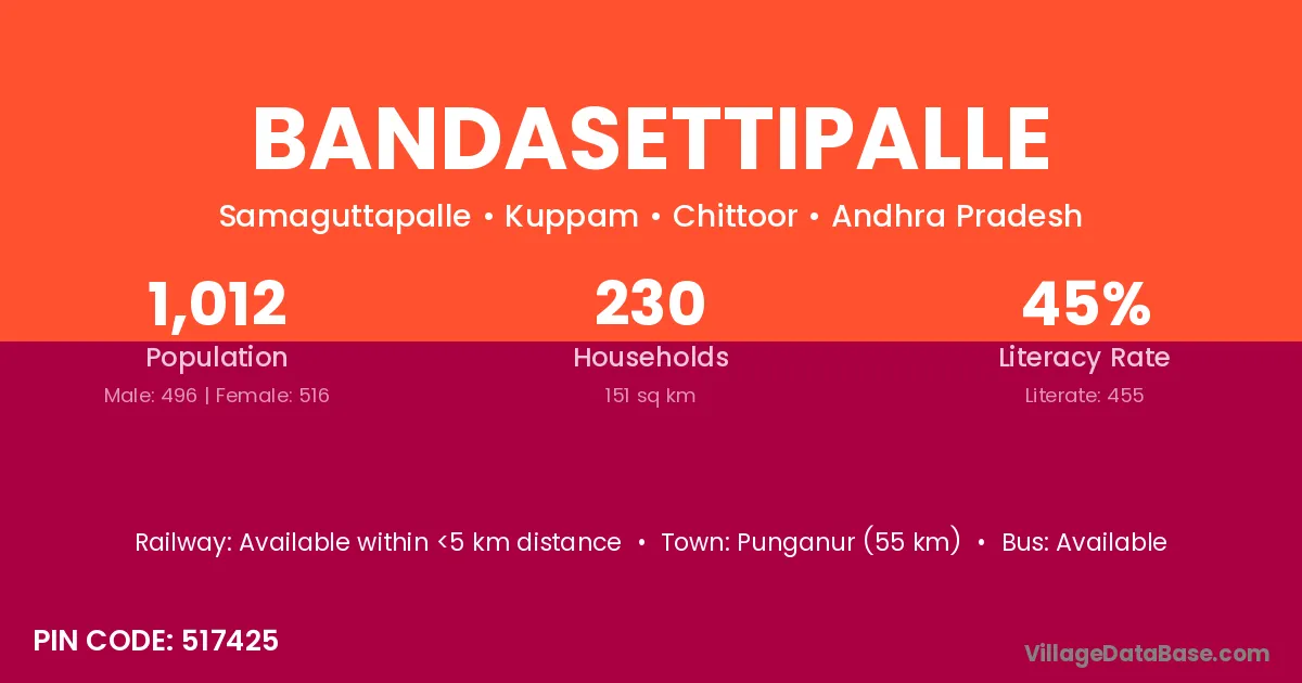 Bandasettipalle village has a total population of 1,012 people, of which 496 are males and 516 are females.