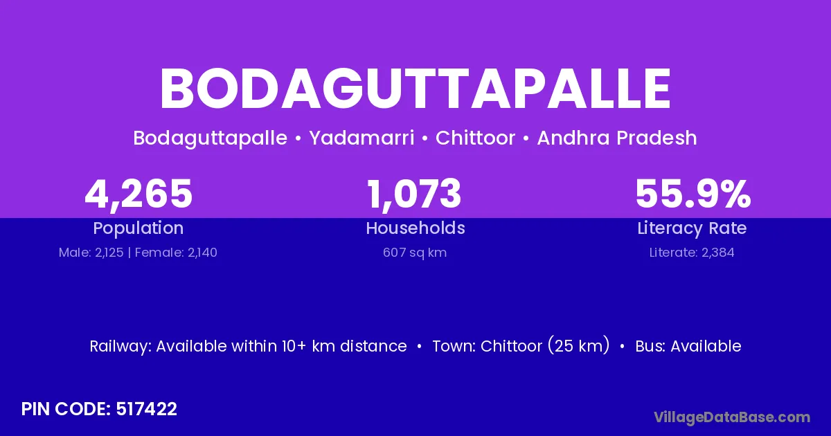 Punganur (61 km) is the nearest town to Bodaguttapalle village for major economic activities and is located approximately 61 km away.