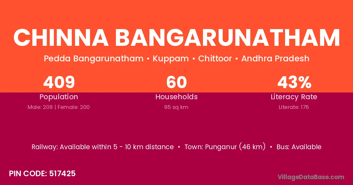 Chinna Bangarunatham village has a total population of 409 people, of which 209 are males and 200 are females.