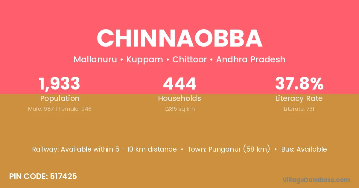 Chinnaobba village has a total population of 1,933 people, of which 987 are males and 946 are females.