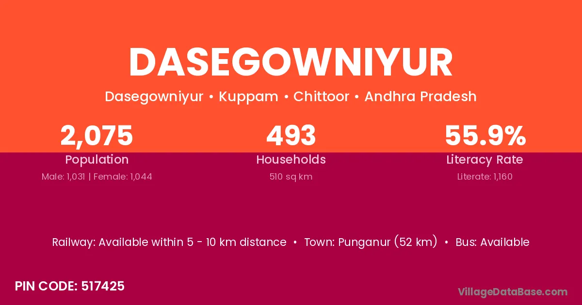 Punganur (52 km) is the nearest town to Dasegowniyur village for major economic activities and is located approximately 52 km away.
