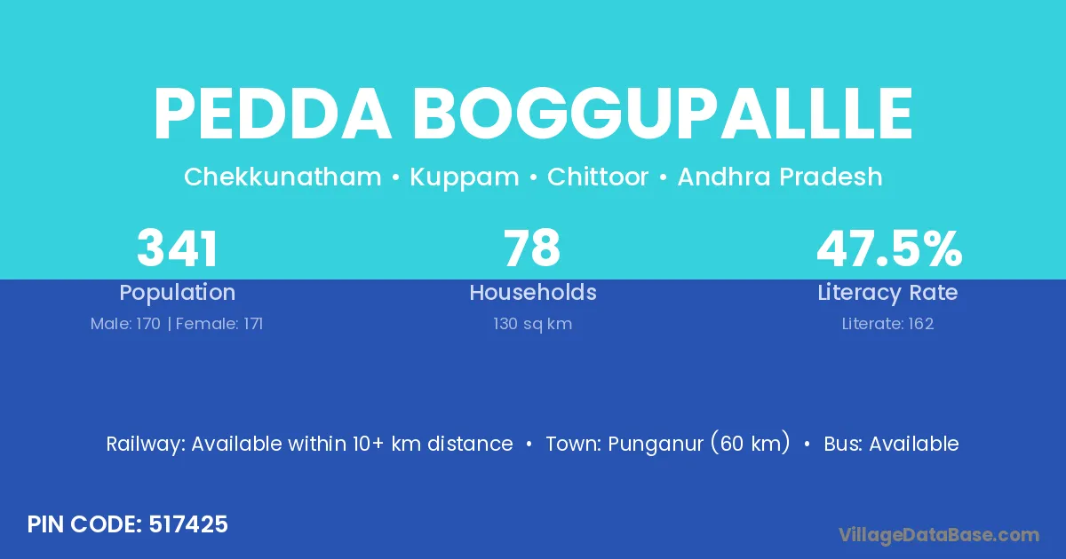 Punganur (60 km) is the nearest town to Pedda Boggupallle village for major economic activities and is located approximately 60 km away.